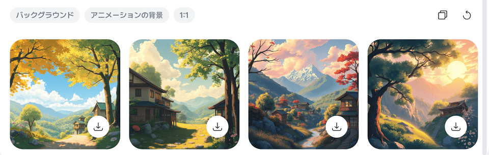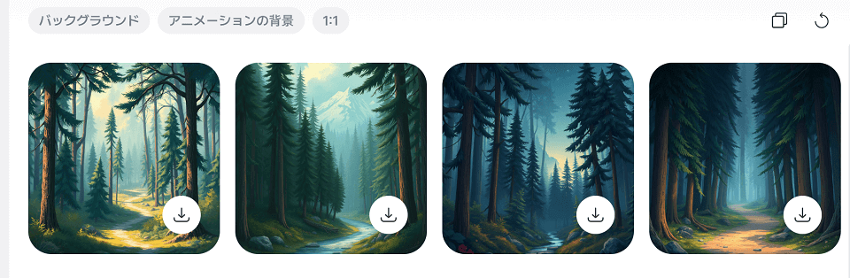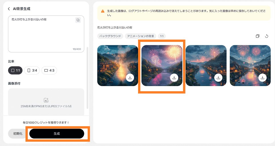 設定が完了したら「生成」ボタンを押します。数秒から数十秒でAIが画像を自動生成します。生成された画像を確認し、気に入ったものがあればダウンロードして利用できます。