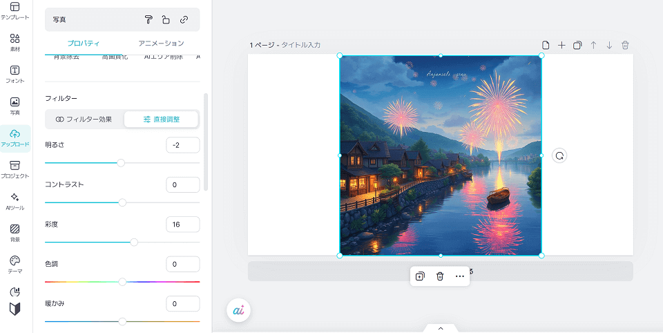 背景を生成した後、そのままミリキャンバス内で文字入れをしたり、フィルターをかけたり、他の無料素材と合成したりと、画像編集まで一貫して行えます。生成から仕上げまで、別のソフトを立ち上げる手間がありません。