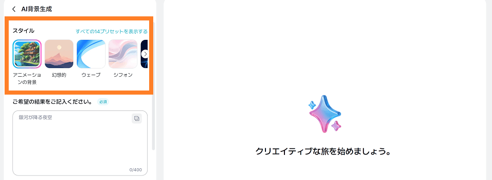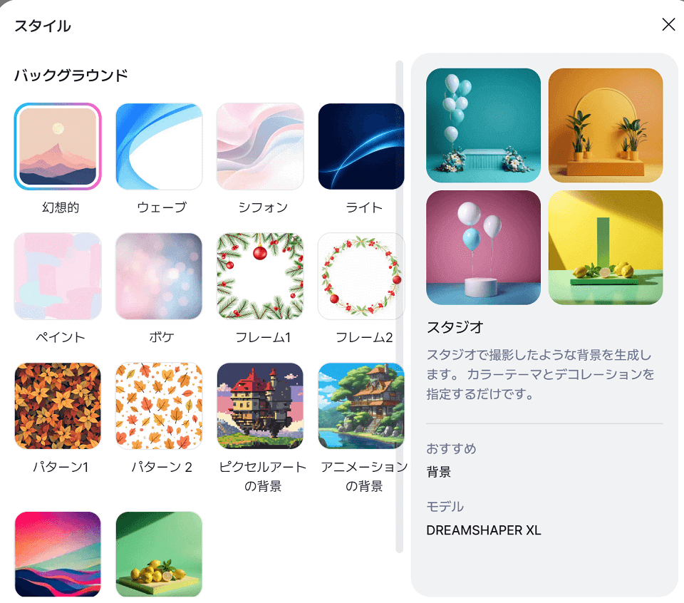 ミリキャンバスには、事前に用意された「スタイルプリセット」(例:幻想的、ウェーブ、シフォンなど)全14種類から選択が可能です。
