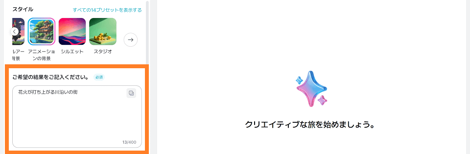 イメージ通りのスタイルを選択している場合、具体的に描写したいメイン、背景の指定だけでOKです!