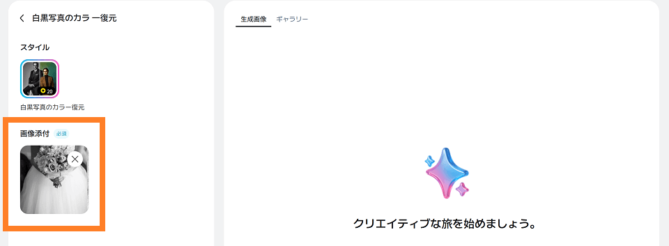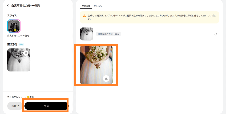 「生成」をクリックすると、AIが数秒から数十秒かけて写真を分析し、自動で着色処理を実行します。処理時間は写真の解像度やサーバーの混雑状況によって異なります。