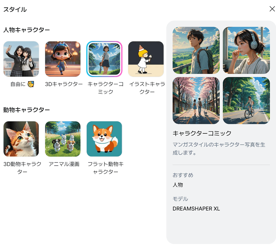 ユーザーの「イメージ」をダイレクトに「イラスト」として出力する能力に長けているからです。ミリキャンバスでは、テキスト指示だけでなく、生成する「スタイル(画風)」を選択できるため、完成イメージに使づけやすいという大きな特徴があります。