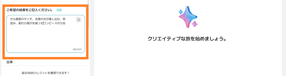 生成したい画像のイメージをテキストに入力(プロンプト入力)