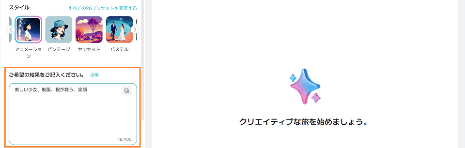 生成に必要なプロンプト(指示文)が分からなくても、プリセットスタイルを利用すればイラストのテイスト(画風)を指定しなくても簡単にイメージ通りの画像が生成されます!