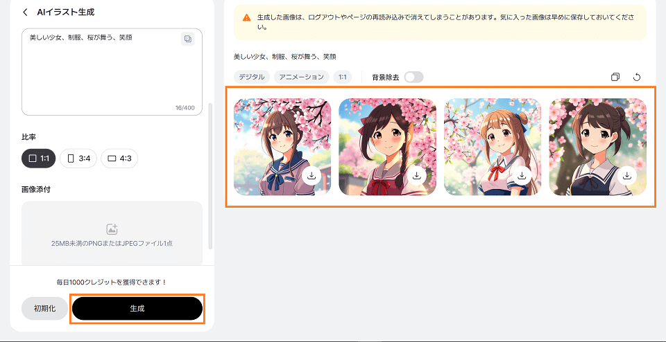 設定が完了したら「生成」ボタンを押します。数秒から数十秒でAIが画像を自動生成します。生成された画像を確認し、気に入ったものがあればダウンロードして利用できます。