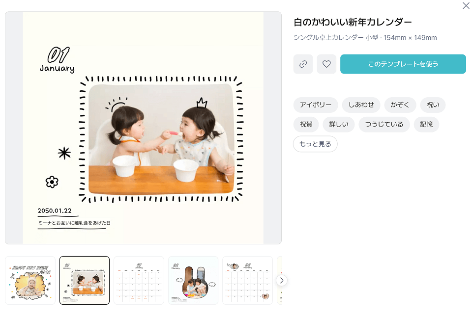 | デザイン | 各月のページに、贈る相手との特別な写真や子供の写真などを大きく配置。写真の下には、その写真にまつわる短いエピソードやメッセージを添えるスペースを設ける。 |