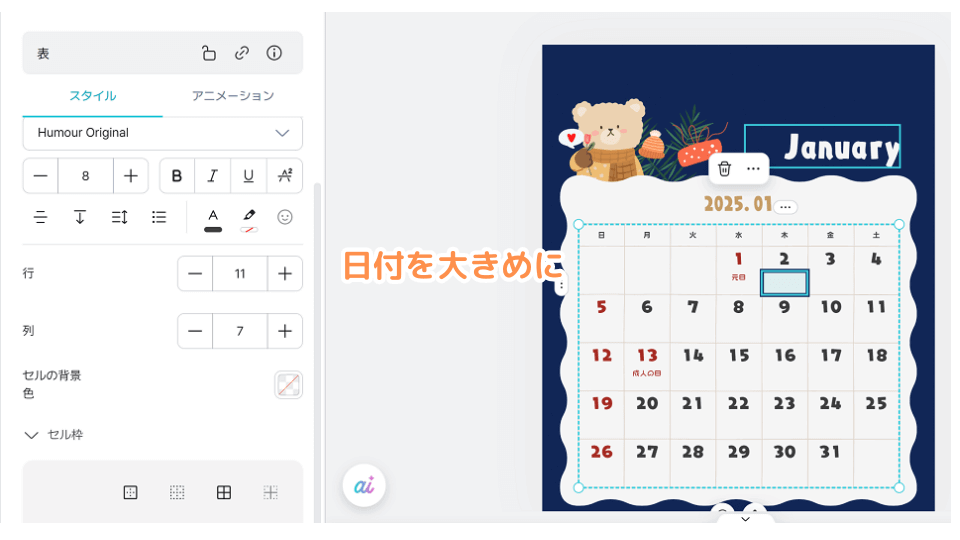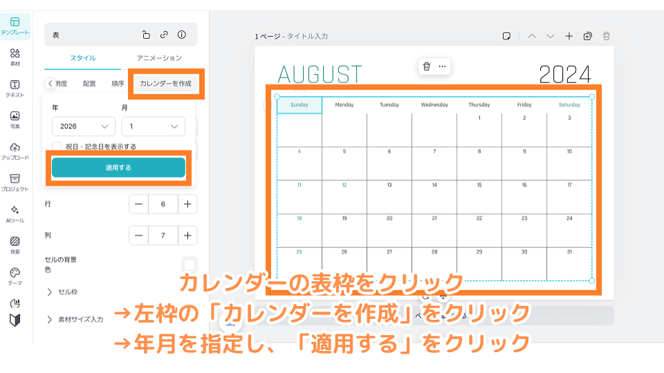 好きなテンプレートデザインを選択後、カレンダーの表枠をクリックし、左枠の「カレンダーを作成」を選択します。設定したい年月を指定すると、すぐに修正することが可能です。
