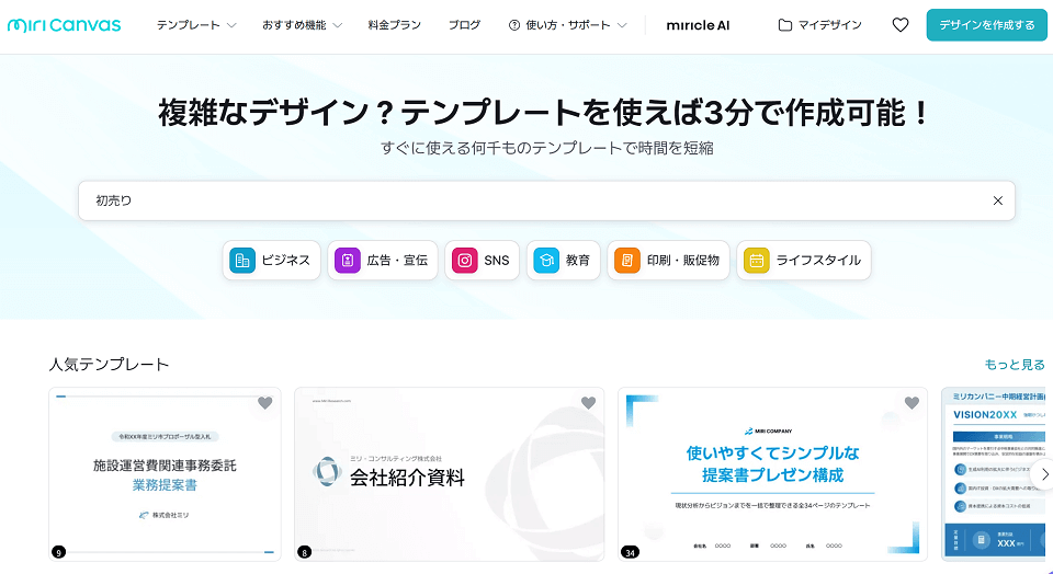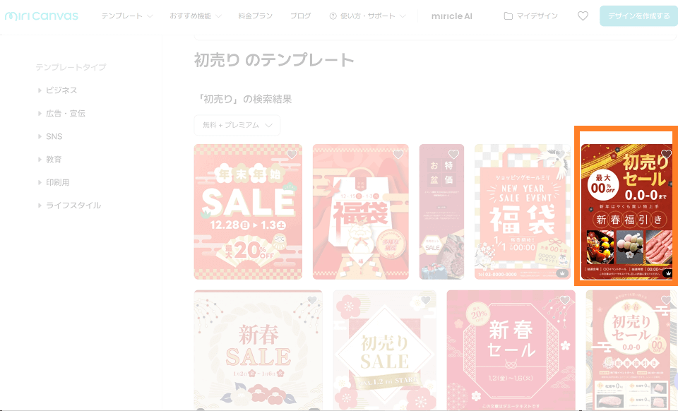 ミリキャンバス最大の強みは、プロのデザイナーが作成した高品質なテンプレートの数々です。初売りや年末年始の販促に特化したテンプレートも豊富に用意されています。