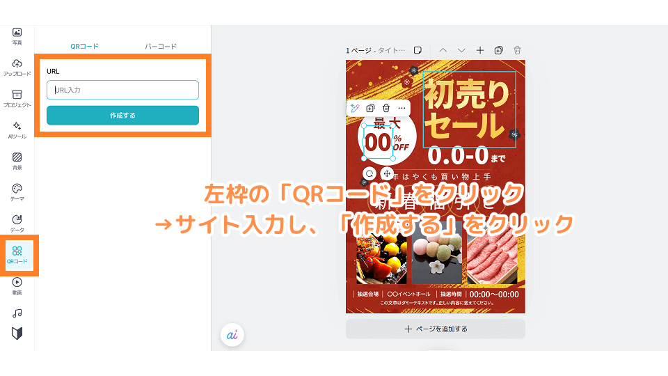 ミリキャンバス内のQRコード作成機能、または外部の無料ツールで作成したQRコード画像をテンプレートに貼り付けましょう。方法は以下の画像を参照。