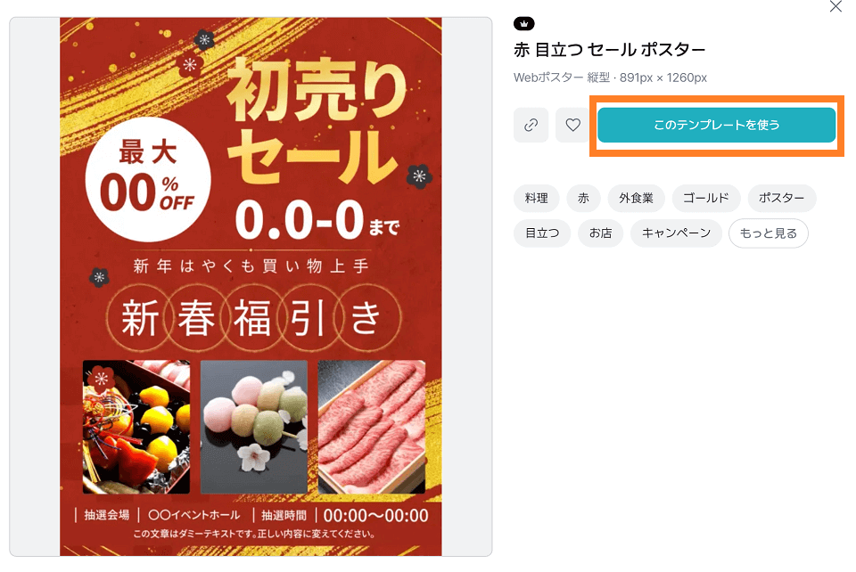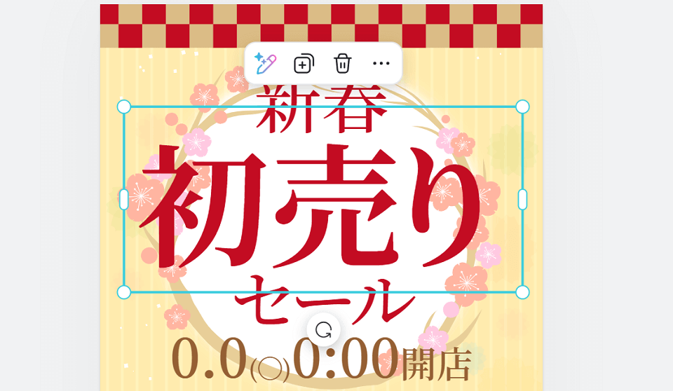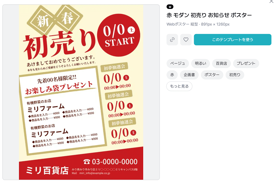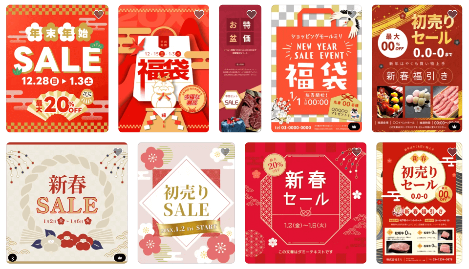 • アイキャッチ部分: 「初売り!」「福袋!」「半額!」といった最も重要なメッセージが、大きなフォントや太字で配置できるレイアウトかを確認します。