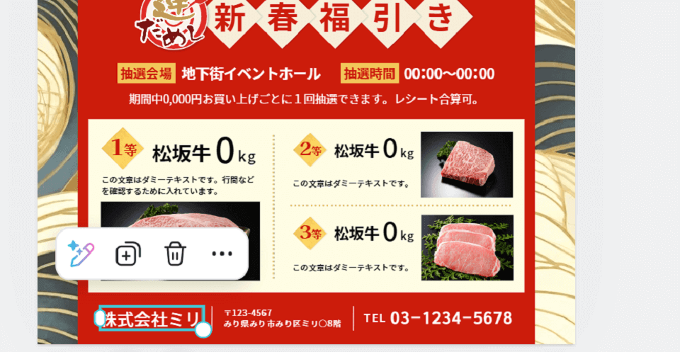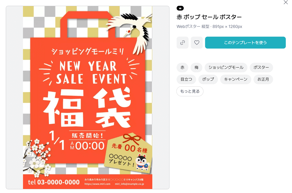 • 必須情報: 店舗名、営業時間(初売り期間)電話番号、ウェブサイトURLが明確に記載できるテンプレートを選びましょう。