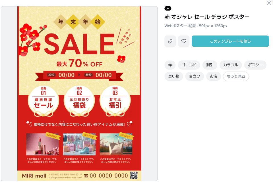 ミリキャンバスには無数のテンプレートがありますが、初売りチラシとして「勝てる」テンプレートを選ぶには、以下を意識しましょう。