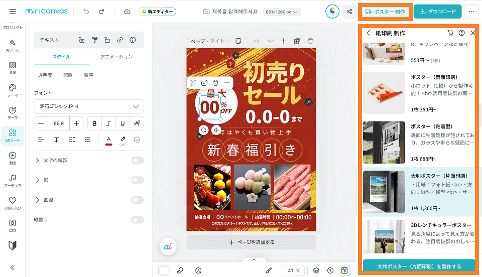初売りはスピード勝負です。デザインの知識や時間がないからと諦めていた方も、ミリキャンバスの高品質なテンプレートを活用すれば、プロに負けない集客力の高いチラシを迅速かつ安価に作成できます。