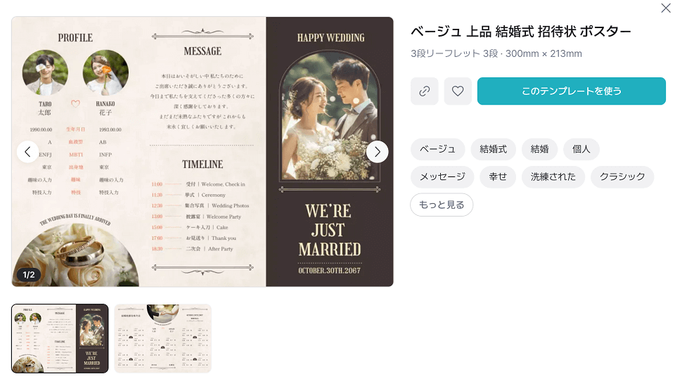 - カスタマイズの自由度: 無料テンプレートであっても、フォント、カラーパレット、配置する写真などを自由にカスタマイズできるため、オリジナリティを出すことが可能です。