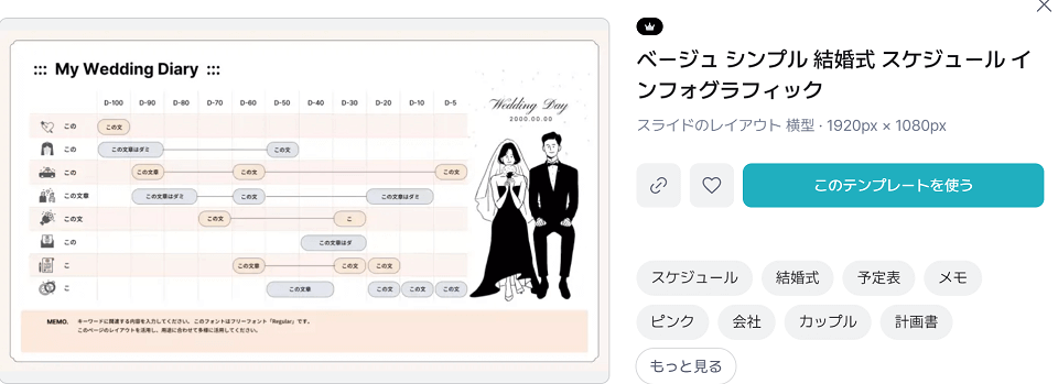 ミリキャンバスの「インフォグラフィック」向けテンプレートやアイコン素材(指輪、ハート、家など)を活用すると、可愛らしく分かりやすい年表が簡単に作れます。