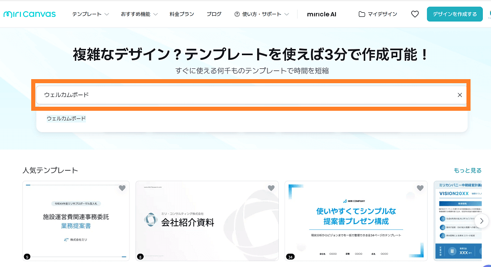 上記紹介したテンプレートを使いたい方、もっと色んなテンプレートを探したい方は、【MiriCanvas】から検索(テンプレート参照を押して「イベントチラシ」で検索)しましょう。登録も無料で簡単にできます。
