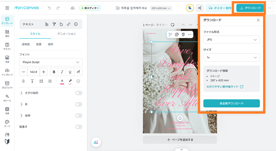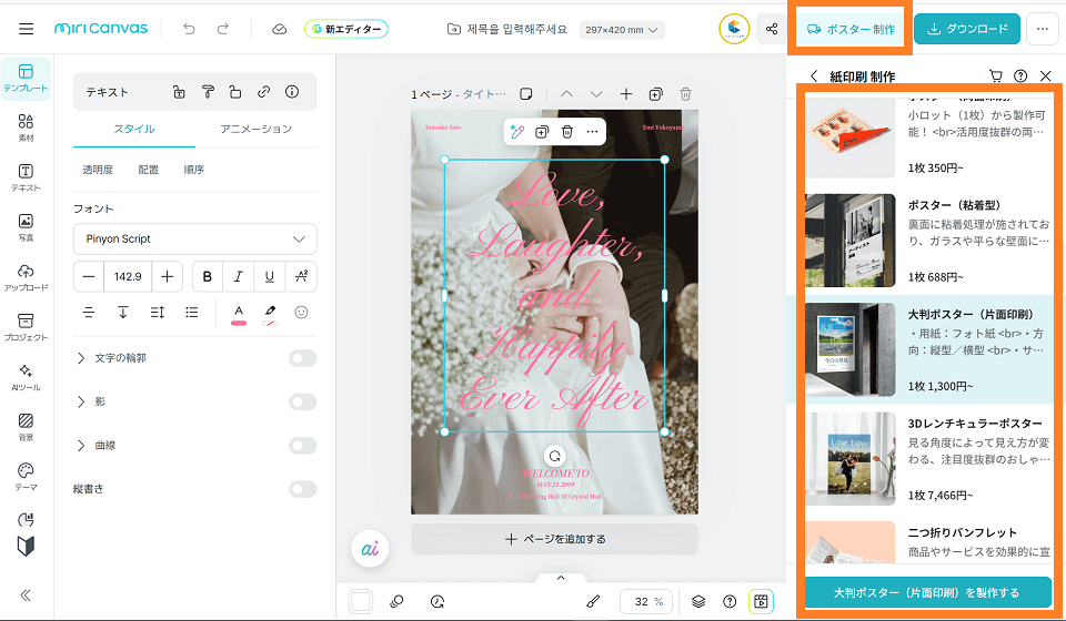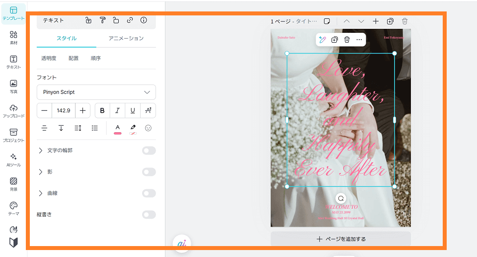 はい、可能です。テキストボックスの設定で「縦書き」を選択できます。和装のウェディングや、「壽」「歓迎」といった和モダンなデザインを作る際にもミリキャンバスは活躍します。