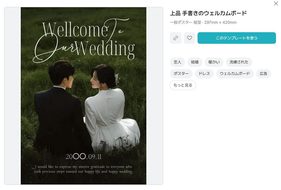 背景色をテラコッタやセージグリーンなどのトレンドカラーにし、白文字で大きく「Welcome」と入れるだけで、海外風のボードになります。イラスト素材(ラインアートの似顔絵など)を使うのもおすすめです。